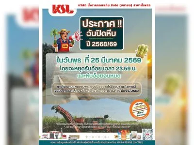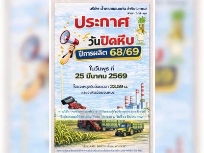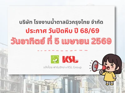 โรงงานน้ำตาลนิวกรุงไทย ประกาศปิดหีบอ้อย ปี 68/69 วันอาทิตย์ที่ 5 เมษายน 2569