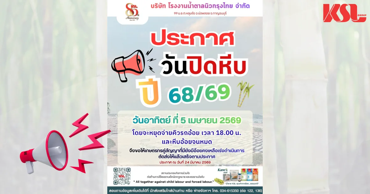 ![[น้ำตาลนิวกรุงไทย] ประกาศวันปิดหีบ ฤดูหีบอ้อย ปี 68/69](https://openkane.kslgroup.com/farmrak_app/images/news/news_16_1774331304932.png)