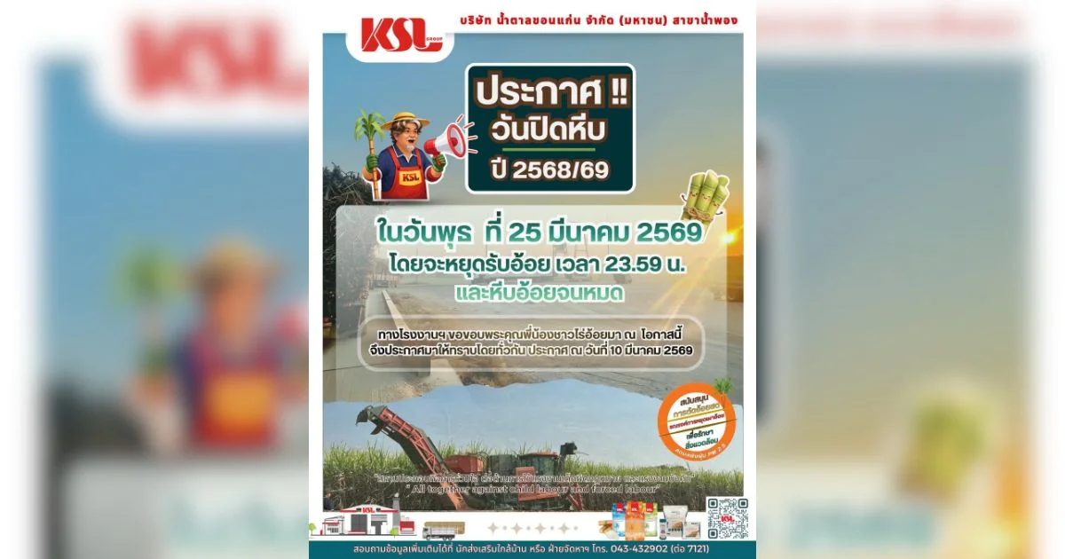 ![[น้ำตาลขอนแก่น สาขาน้ำพอง] ประกาศวันปิดหีบ ฤดูหีบอ้อย ปี 68/69](https://openkane.kslgroup.com/farmrak_app/images/news/news_19_1774336017098.jpg)